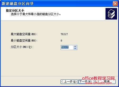 第五步:在图6所示界面中选择适当的分区大小,输入完成后单击“下一步(N)”。说明:对于FAT32格式单个分区不允许超过32G,如果容量超过32G分区只能选择NTFS格式。可以通过第三方软件(如:PowerQuest PartitionMagic 8.0)来建立超过32G的FAT32分区。