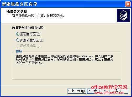 第四步:在选择要创建的磁盘分区类型中选择“主磁盘分区”即可,如图5所示。单击下一步。