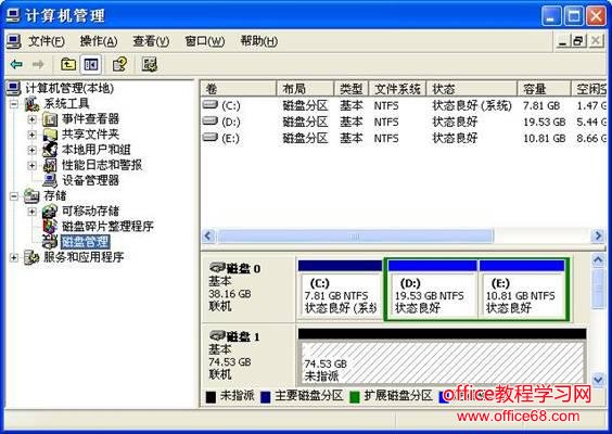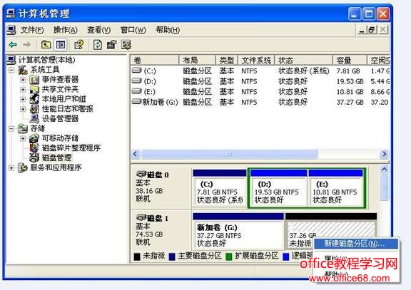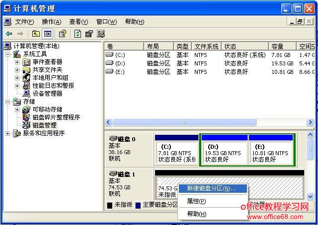 第二步:在计算机管理界面中单击“磁盘管理”项,如果是第一次使用时系统会出现磁盘初始化的提示,确认后会出现图(2)所示界面。在界面右栏中的“磁盘1”为新加入的移动硬盘,后面的“未指派”区域表示没有建立磁盘分区的空间(空间的大小与实际硬盘规格有关,在您系统显示中磁盘的空间未必与本图显示一致)。
