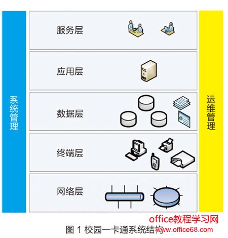 本文基于清单式管理方式,提出了一个以服务清单、业务清单、运维清单为核心的校园一卡通系统管理模式。通过围绕三张清单构筑人员管理、设备管理、需求管理、质量管理、知识库管理和事件管理六个具体的管理模块,从而解决系统维护管理中的难题,实现规范化、可视化、精细化的管理目标。 校园一卡通系统功能涉及校园的方方面面,它的运行情况直接影响校园的金融和管理工作。系统的用户覆盖校内所有人员,通常由多部门共同参与系统维护工作。系统的维护管理工作比较复杂,需要进行统一的、规范的、可量化的管理。 系统管理的需求与现状 校园一卡通系统通常由网络层、终端层、数据层、应用层和服务层组成,如图1所示。