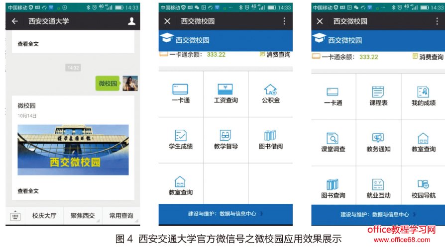 截至目前,该研究成果已经集成入西安交通大学官方微信号中(如图4所示),学生端集成的微服务共计9项,教师端集成微服务共计7项,数据量达10余万条。