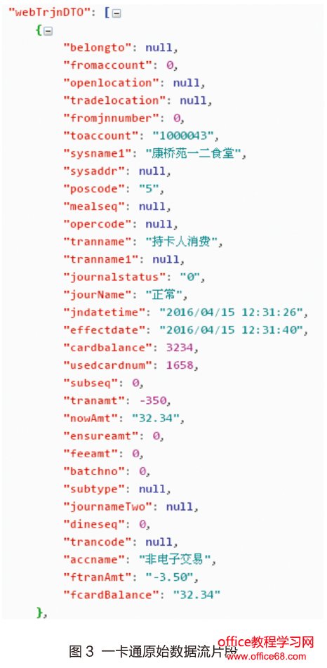 为提高移动微校园的数据交换速度,引入Json格式作为数据交换的标准传输格式是当前比较流行的移动轻量级数据交换方式,其不仅提高数据交换效率,又具有较高通用性,适合各类数据库系统间的数据交换,且扩展性强。以用户一卡通消费分析为例,其历史消费记录的json数据流片段如图3所示,移动客户端仅仅需要展示消费时间、地点、交易额及卡内余额信息,但原始数据流却提供了非常庞大的冗余字段,导致数据传输缓慢,且与用户身份信息相关的字段缺失。因此数据清洗与封装的处理过程如下: