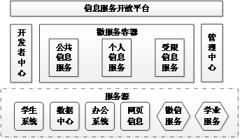 “北京大学信息服务开放平台”基于本文所述框架设计和实现,平台主要由开发者中心、管理中心和微服务容器构成,如图2所示。开发者中心用于开发者注册应用和注册需要发布的服务;管理中心用于开发者应用审核、发布服务审核、服务授权审核等。按照访问权限划分,运行在微服务容器中的数据服务大致分为三类: