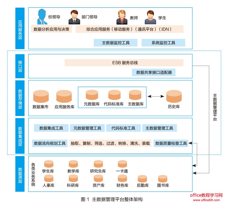 应用服务层简单分为服务分析决策和师生综合服务两大应用领域,同时引入系统监控工具和主数据监控工具保障平台的运行。系统运行监控工具主要对整个平台进行系统健康检查,对集成过程、运行情况和数据情况进行运维监控。主数据管理工具对主数据质量监督,既抽采又监控,切实推进业务系统数据质量。