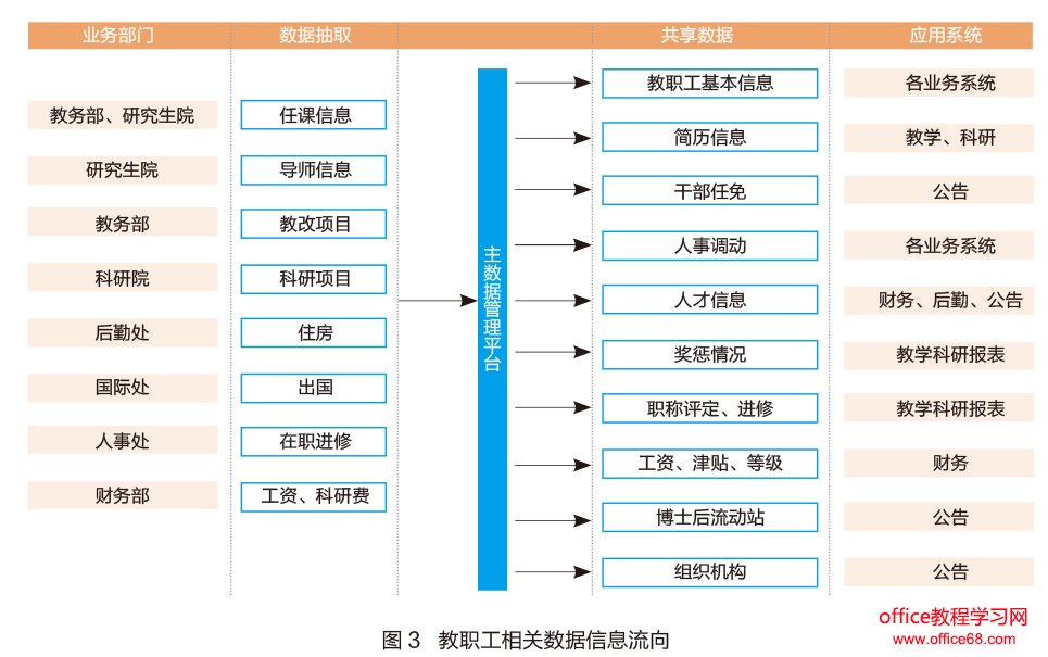 数据流向规划能够规范业务系统建设与集成,指导信息化建设方向,持续积累业务数据。设计数据流向规划工具能够规范业务系统的建设与集成,有效持续积累数据。下面,我们以教职工数据的流向规划(如图3所示)为例,进一步阐述数据流向规划的重要性。平台首先从业务部门提取了任课、职称、教改、科研、工资等信息,归纳出基本信息、简历信息、奖惩情况、职称评定进修等共享数据。最后,共享数据将能够广泛具体应用在教学、科研、财务、报表、公告等领域。共享数据的正确性和唯一性是数据再次利用的基础。