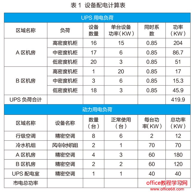 电气子系统 北京师范大学IDC机房配电系统采用国家A级机房建设标准,配电系统由大楼配电室引两路市电电源至机房配电室,电源容量为每路800kW,机房配电柜总开关采用1600A,配电室安装两台400kVAUPS设备组成2N系统提供机房的电力保障。配电系统采用双回路配电结构,一台列头配电柜引自UPS1输出配电柜,另一台列头柜引自UPS2输出配电柜。两台列头柜内的两个独立电气单元分别通过工业连接器连接至机柜内的PUD。每个配电回路均能满足计算机机柜100%的用电负荷,任何一路空开或线路的故障均不影响另一路电源的正常使用。机房每个机柜的用电都经过详细测算,根据不同需求设计用电配制。设备配电表如表1所示。