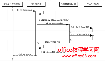 浏览器支持HTTP协议,对于客户端发出的HTTP请求,浏览器会解析成请求头、请求体的形式,对于服务器返回的HTTP响应,浏览器会解析成响应头、响应体的形式.但是,当前的浏览器都不支持COAP协议,因此,在网址栏输入coap://localhost:5683,浏览器是不解析的.实现教室监控系统的关键就是处理COAP请求和COAP响应,Node.js支持COAP,可以将COAP请求响应封装在服务器里面,需要访问传感器节点时,在其请求处理函数里面发送COAP请求,访问传感器节点,并接收返回的COAP响应.具体处理过程如图6,从图中可以看出,COAP请求是由服务器代为发出的,COAP响应也由服务器接收并解析,COAP协议层对用户来说是透明的,用户只需要发送普通的http请求就可以访问6lowpan网络资源,这样就解决了浏览器不支持COAP协议的问题.