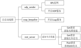 从易用性和成熟度考虑,选取Contiki作为节点实现6LoWPAN协议栈的操作系统,选取RPL为节点自组网的路由协议,并借助网络分析软件帮助理解和诊断网络协议.节点服务器为自启动线程添加了三个线程,分别是udp_sender_process、coap_keepalive_process、rest_server_process,各自维护着自己的服务.要实现传感器节点,关键在于将传感器资源添加到节点服务器上,提供给外部访问.节点自启动线程如图3所示.