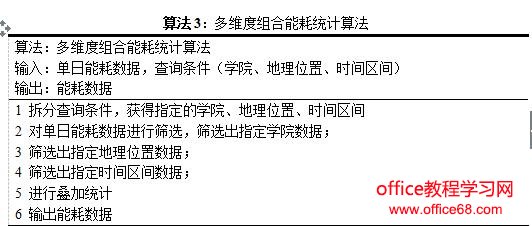 对于某一台仪器设备的某一天的能耗数据进行统计,通过相应计算处理即可得出某仪器设备某天的能耗数据,将该数据作为单独的数据项,所有的仪器设备的数据形成集合称为仪器设备单日能耗数据。然而,再进行仪器设备能耗数据统计分析时,需要按照不同的维度,如:学院、地理位置、时间区间等进行组合对能耗数据进行统计。多维度组合能耗统计算法,实现从学院、地理位置和时间区间三个维度的组合查询,从而反馈出相应的能耗统计结果。如算法3所示,实现描述如下: