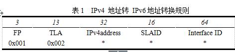 N=ηp(A)∩ηq(A)∩ηr(A) 对于满足条件p、q、r的能耗数据N,进行累加计算即所求能耗。例如,当需要查询计算机学院、2015年1月-2015年12月的能耗数据时,首先将查询条件拆分为学院条件和时间区间条件两个部分,在单日能耗数据中筛选出计算机学院并且满足2015年1月-2015年12月的数据,然后将数据进行累加,结果即为满足条件的能耗数据。 2.4 IPv6及其过渡技术 随着计算机技术和网络技术的不断进步,IPv4 协议面临着比如地址空间耗尽、路由表爆炸等一系列的问题[11]。为了解决IPv4地址短缺和在物联网体系部署过程中大量的IP地址的需求的问题,本平台设计IPv6(Internet Protocol Version 6)地址对仪器设备能耗监控终端进行部署。但是,现阶段大量使用的IP地址仍然是IPv4地址,那么在对仪器设备进行部署时,就需要对两种IP地址进行兼容处理和响应的转换处理。本文提出的能耗监控平台采用隧道技术和地址转换技术处理兼容性问题。 如表1所示,表头为相对应标识在IPv6地址中占据的地址长度,如格式前缀 (FP)占3个字节而且数值为001;顶层聚合标识符(TLA)占13位,为002;后面是32位的IPv4地址(IPv4address),接下来是16位的服务品质协议标识(SLAID)和64位的网络接口标识(Interface ID)[12]。可以实现将IPv4 地址转换成IPv6地址,通过双协议栈和6to4隧道,解决兼容性问题。通过将前缀2002::/16和该节点IPv4地址进行组合,形成一个48位前缀的6to4地址2002:IPv4地址::/48。