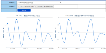 图6 平台实现的技术方案3.2 原型介绍 基于IPv6校园的仪器设备能耗监控平台主要包括:实时功率监控、仪器设备历史运行机时数对比、学院指定时间区间能耗统计、实验室指定时间区间能耗统计、单台设备指定时间段能耗统计等功能。 为对于某两台校园仪器设备的实时功率监控的对比图,通过实时功率的曲线对比直观的反应两台仪器设备的实时功率并且并排显示形成对比。如图7所示,编号为11007119的激光打印机在16:51:05和16:51:30出现功率高峰。
