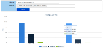 图7 校园仪器设备实时功率监控对比图 图8为对多台设备的各运行状态累计时间的对比图,以柱状图的形式展现两台设备的运行、待机、异常时间。图8中编号为20001662的恒温水溶箱累计运行时间近900小时,包括待机400小时和异常100小时。而编号为11002571的PCR仪累计运行时间933小时,包括待机168小时和异常10小时。通过柱状图对比,为高校实现节能减排和仪器设备使用规划等提供直观的统计分析数据。
