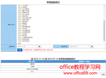 图8 仪器设备历史运行机时数对比图 对于单日能耗数据可以进行多维度的组合查询的方式,实现不同角度的统计分析。如图9为字2015-12-01到2015-12-31的选定三个学院的能耗统计。
