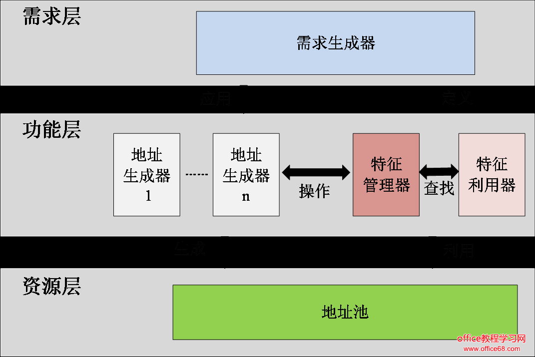 为了管理和充分利用已有的IPv6地址生成方案,我们设计了一个通用的需求驱动的IPv6地址生成方案管理系统.该系统由IPv6地址生成方案的设计需求驱动,分为三个逻辑层次:需求层、功能层和资源层,如图1所示.需求层用于确定系统所选需求,并将配置的需求对全网进行消息通告.功能层包含地址生成以及需求处理的功能模块.资源层包含具体地址生成方案使用的地址池.
