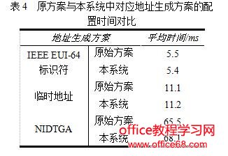 我们按照图2的网络拓扑部署本文提出的地址生成方案管理系统,在本系统中实现和比较了三种典型的地址生成方案:IEEE EUI-64标识符、RFC4941中提出的临时地址方案、NIDTGA方案.针对以上每种方案,我们在本系统中分别测试了100次配置地址的时间,并与原方案作了比较.实验结果如表4所示,我们发现在本系统中地址生成方案的性能并未降低,本系统是有效的.