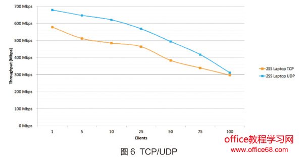 3.系统吞吐量下滑与TCP或者UDP没有关系。 如图6所示,通过对比并发终端数量变化前后系统的TCP和UDP性能,可以发现UDP同样存在近似的性能下滑,因此可以排除TCP窗口机制导致性能下降的潜在可能。