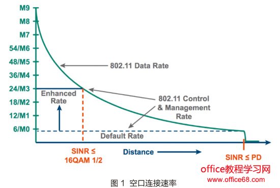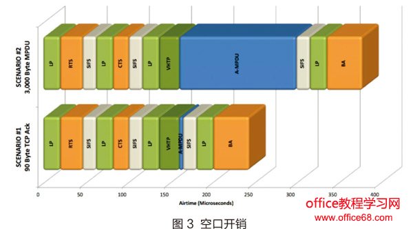 图2抽象地显示出构成相同的802.11管理帧、控制帧和数据帧在采用不同的速率时对空口效率的影响。很明显,第二张图中由于管理帧和控制帧采用24Mbps速率进行发送,因此每一帧可以消耗更少的空口时间,使无线信道更多地处于空闲状态,所以可以提升空口效率,达到性能优化的目的。