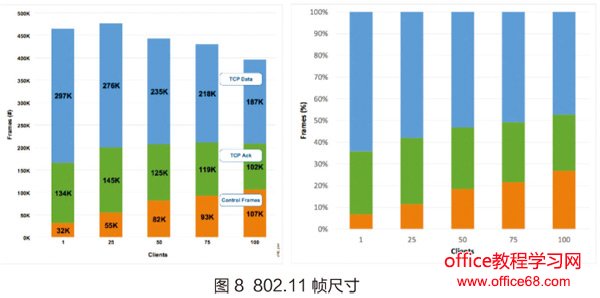 如图8中802.11帧尺寸的维度进行分析,可以看到小于64字节的帧数量从32K增长到107K,大约3倍多的比例。根据前面的研究,报文负载越小,射频空口的效率就越低,网络吞吐量越差;反之亦然。因此,网络中传输的短报文数量大幅增加严重拉低了系统的吞吐量性能。对控制帧的进一步分析发现: