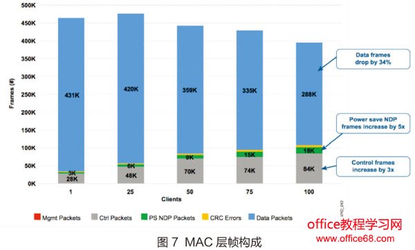 4.随着并发终端的增加,MAC层的帧构成发生了重大变化,这才是导致系统吞吐量下降的主要原因。 如图7所示,随着并发终端数量从1增加到100,网络中的数据帧数量减少了34%,而与此同时,控制帧数量则增加了3倍,用于唤醒Wi-Fi终端的Power Save NDP帧则更是增加了5倍。