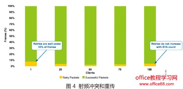 802.11数据帧的负载越大,用于传输真实数据负载的空口时间就越长,相对于整个TXOP中的传输开销,其空口效率就越高; 802.11管理帧和控制帧都是固定长度的短帧,并且传输速率相对数据帧低很多,因此管理帧和控制帧数量越少、速率越高,网络的空口效率就越高。 多终端接入的性能影响 在802.11网络中,人们普遍的感受是:当一个AP下连接了较多的终端时,这个AP的整体性能以及用户体验会快速下降。当然,这里有一个隐含条件:这个AP和连在上面的Wi-Fi终端处于一个独立的冲突域。因此,关于这个现象更加精确的描述应该是:当一个冲突域中存在较多的终端时,这个冲突域的整体容量和用户体验会快速下降。进一步的实验发现,这个现象的发生具有一定的普遍性,并且与终端构成不具有相关性。由实验数据可得,如果以只有一个终端时的系统吞吐量作为参照,则无论终端类型为1x1、2x2或者3x3,当并发终端数量在25个时,系统吞吐量仅下降5%~10%;当并发终端数量在50个时,系统吞吐量下降大约10%~30%;当并发终端数量达到100个时,系统吞吐量下降高达50%~60%。 从理论上分析,导致这一现象的可能原因有以下四个: 1.射频冲突和重传;2.连接速率的自适应下调;3.TCP滑动窗口机制导致;4.MAC层帧构成的变化。 然而,通过在不同并发终端数量环境下进行的抓包分析,我们可以推断出: 1.射频冲突和重传不是多终端环境下系统吞吐量下降的主要原因。从图4中可以看到,随着并发终端的增加,射频重传比例基本保持稳定,并未出现明显的同步增长,因此并非系统吞吐量下降的主要原因。