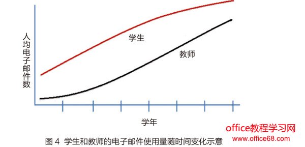 现在来看数据表本身。如图4那样使用数据表作图,就获得了另外一个视图和更多信息。从数据表中可以明显看出,学生接收和发送的电子邮件比教师大约多一倍,而且每年师生群体的电子邮件数量都有显著增长。这和我们的预期相一致么?如果是(或者不是),那么为什么?这说明了与学生和教师交流行为有关的哪些事情?进一步,如果更深入地观察表格,可以看出来学生的电子邮件数正在趋近水平,而教师的电子邮件还在增长,尽管增长正在放缓。这就引出了一个讨论主题,关于现状如何,以及是否表明存在一个趋势,未来将会持续甚至会加速发展。这些显然都是可以进一步探索的议题,也许还要额外收集数据。