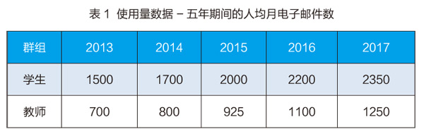 如何向院校的各种群体提供最好的电子邮件服务,这是战略规划委员会热议的一个话题,尽管这个话题在向云上迁移的过程中很快会变成“怀旧经典”。那么需要哪些数据才能让对此事的研讨变得卓有成效?当前的使用量和成本数据是显然的当然选择,然而行业趋势和其他预测也同样有用。下面的这个例子展示出了这些类型的数据是如何引出讨论主题的,此处将仅仅聚焦于学生和教师的使用量(见表1)。