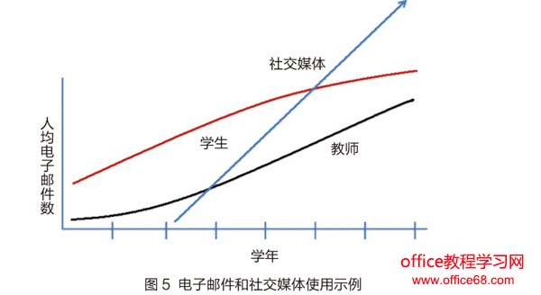 如果收集到额外的数据,比如社交媒体的发文量,也许就能找到电子邮件增长放缓的一个解释(如图5所示)。事实上,对于大多数学生而言,社交媒体的数据点甚至都落到了图之外。增添了社交媒体发文量数据后,更令人担忧的一个普遍性问题就浮现出来了,即校园内的师生交流发生了什么变化(考虑到教师更依赖电子邮件),也许这是一个要求专门进行问卷调查的问题。假设设想中的这个变化--学生正在更多地使用社交媒体来取代电子邮件是真实的,是否教师意识到了学生的交流习惯正在变化(学生们甚至都不再阅读教师发出的大部分电子邮件了)?是否应该鼓励教师更多使用社交媒体来补充(或者取代)电子邮件?考虑到IT部门和学生使用的社交媒体平台并无关系,校园交流中社交媒体的使用不断增长对于IT部门而言意味着什么?另外,当问题发生时,对于IT部门要处理的资源和人员类型而言,又意味着什么?其他因素如通讯的完整、安全和可用也都要加以讨论。