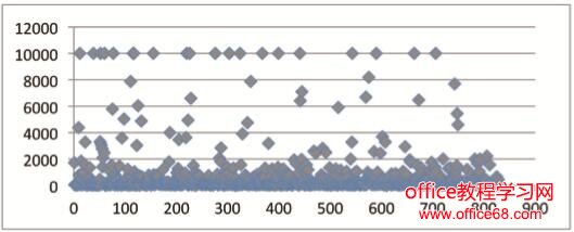 图1 各类访问延时分布 通过图2可以清晰地比较各个访问延时的总体情况(横坐标对应可成功访问的829个网址,按照访问频度排名高低从左到右排列,纵坐标表示各个网址对应的访问延时,单位毫秒)。为了便于观察,对于访问延迟大于一万毫秒的统一按照一万毫秒来标记。