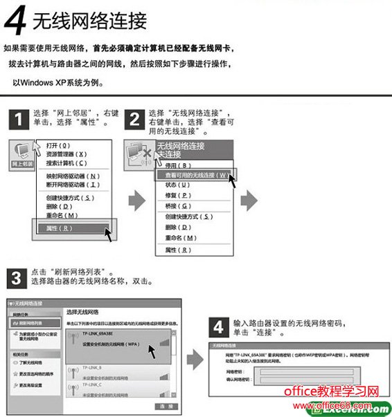 图3 4、部分网友用的无线路由器的话,则必须连接无线网络。设置方法在鼠标右击“网络邻居”在上面选择“属性”选项,然后选择“无线网络连接”选择“查看可用的无线连接”,在下一步点击“刷新网络列表,选择路由器的无线网络名称,然后在输入路由器设置的无线密码,点击”连接“即可完成操作了。但是在设置无线网络连接的话电脑配备了无线网卡才能使用的。如图所示: