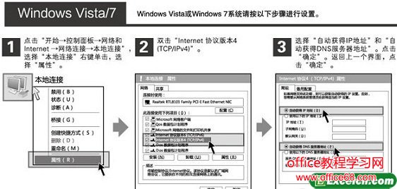 图1 2、连接好路由器和硬件之后,查看到路由器的指示灯是正常状态之后,然后现在对电脑上设置了。依次点击打开win7的开始菜单,然后找到“控制面板”选项打开它,在点击“网络和共享中心-网络连接-本地连接”,然后在右击“本地连接”弹出窗口上点击“属性”选项,在属性的窗口上双击“internet协议版本4”然后在选择“自动获取ip地址”和“自动获取dns地址”即可。如图所示: