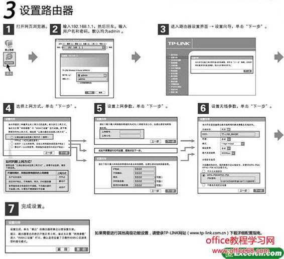 图2 3、现在电脑的一些基本设置完成了,开始设置路由器吧。首先打开浏览器,然后输入登陆网址,一般是“192.168.1.1”然后在输入用户名和密码,默认的位admin即可打开路由器设置界面了。点击左边的“设置向导”单击“下一步”然后在选择“上网方式”,单击“下一步”,现在开始设置上网参数,设置完成继续单击“下一步”,现在设置无线参数,设置完成单击“下一步”这样即可完成路由器的全部设置了。如图所示: