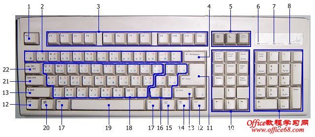 标准的桌面计算机 键盘的区域 1. Esc 键:是「Escape」的简写,意思是「脱离」、「跳出」之意,在 Windows 操作系统里,Esc 可用来关闭对话窗口、停止目前正在使用或执行的功能等。 2. 数字列:用来输入数字及一些特殊符号。 3. 标准功能键:提供给应用程序定义各种功能的快速指令,其中 F1 的定义已经标准化,是代表「显示说明文件」的意思。 4. Backspace:在进行文字输入时,按下 Backspace 会删除你所输入的最后一个字,并将文字光标后退一格。 5. 扩充功能键:本区域属于非标准的功能键,一般应用程序甚少使用。 6. NumLock 指示灯:此信号灯亮起时,表示数字专区(区域 9)目前可用来输入数字,此灯若是熄灭,则数字专区的键盘会变成编辑键(其功能类似区域 10)。数字专区左上角的 "NumLock" 键可用来切换本灯号。 7. CapsLock 指示灯:打小写输入指示灯,详细说明请见下一小节。 8. ScrollLock 指示灯:此灯号亮起时,用户可以使用键盘来进行卷页动作,而不必使用鼠标。 9. 数字专用区:本区域可专门用来输入数字及加减乘除符号。本区域是专为从事数字相关工作的人而设计。 10. 编辑键区:包含箭头键等文书编辑专用键。 11. Enter 键:在进行文字编辑时,按下 Enter 键可以强迫进行断行。 12. Ctrl 键:主要用途是让应用程序定义「快捷键」,例如 Ctrl + C 代表复制、Ctrl +V 代表贴上等。 13. Shift 键:用来切会大小写输入,详细说明请见下一节。 14. Windows 鼠标右键:任何时候按下本键,相当于按下鼠标的右键。应用程序对鼠标右键的典型反应是出现鼠标右键选单。 15. Windows 「开始」键:任何时候按下本键,都会开启 Windows 「开始」菜单 16. 标点符号区:本区域用来输入标点符号。 17. Alt 键:用来开启应用程序的菜单键,例如 Alt + F 可开启「档案」菜单。 18. 英文字母区:用来输入英文字母,配合 Shift 键使用,可输入大写及小写字母。 19. 空格键:用来输入空格键。 20. Windows 「开始」键:功用同 15. 21. CapsLock 键:用来切换 CapsLock 灯号。 22. Tab 键:又称「定位键」,在纯文本输入软件里,按一次 Tab 键会输入 4 个或 8 个空格。在排版软件里(如 Word)则代表「跳到下一个定位点」的意思。 Shift 键的功能 键盘区域中的数字列,英文字母区,以及标点符号区里,每一个键都可以用来输入两种字符,当你按下这些区域的任何一个键时,真正被输入的字符决定于两个因素: 1. CapsLock 灯号是否亮起。 2. 是否有同时按下 Shift 键。 例如,当 CapsLock 灯号未亮时,单独按下英文字母区的任何一个键,会输入该键代表的小写字母;若同时按下 Shift 键及字母键,则会输入大写字母。当 CapsLock 灯号亮起时,其行为正好相反:单独按下字母键会输入大写字母,同时按Shift及字母键会输入小写字母。 手指位置分配 主要输入区指位分配 有效率的打字方法需要「十指齐用」,其中拇指只负责按「空格键」,其他八只手指则通常依照下图描述的方式分配键位: