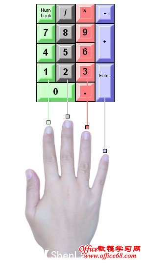 键盘主要输入区的指位分配 大家可以看出负责最多按键的是右手小指,其次则是左手小指。由于小指是手指里运用最不灵活的一指,因此在学习打字时务必要多下苦功才能克服这项困难。不过若单以「字母」键来看得话,则是左右手食指负责最多的字母按键。 数字专区的指法 如果你在学业或工作上常需要输入大量的数字数据,则熟练数字专区的使用将可大大提高你的工作效率,数字专区只用到右手的 4 之手指,其指位分配如下图所示:
