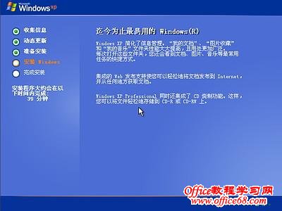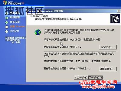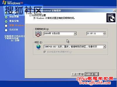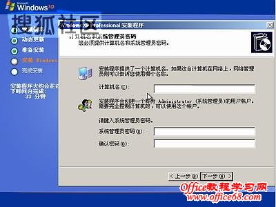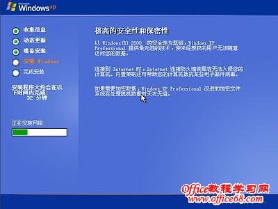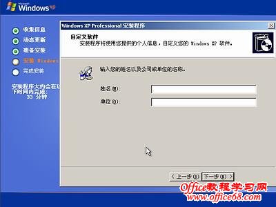 图8中开始复制文件,文件复制完后,安装程序开始初始化Windows配置。然后系统将会自动在15秒后重新启动。重新启动后,出现下图9所示 ![]() 9 ![]() 过5分钟后,当提示还需33分钟时将出现如下图10 ![]() 区域和语言设置选用默认值就可以了,直接点“下一步”按钮,出现如下图11 ![]() 这里输入你想好的姓名和单位,这里的姓名是你以后注册的用户名,点“下一步”按钮,出现如下图12 ![]() 如果你没有预先记下产品密钥(安装序列号)就大件事啦!这里输入安装序列号,点“下一步”按钮,出现如下图13 ![]() 安装程序自动为你创建又长又难看的计算机名称,自己可任意更改,输入两次系统管理员密码,请记住这个密码,Administrator系统管理员在系统中具有最高权限,平时登陆系统不需要这个帐号。接着点“下一步”出现如下图14 ![]() 日期和时间设置不用讲,选北京时间,点“下一步”出现如下图15 ![]() 开始安装,复制系统文件、安装网络系统,很快出现如下图16 ![]() |