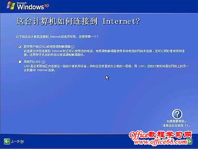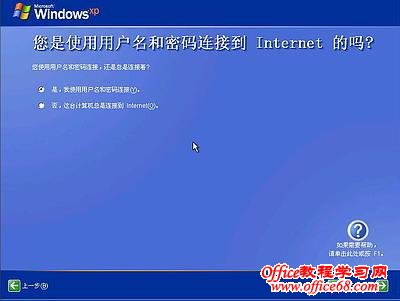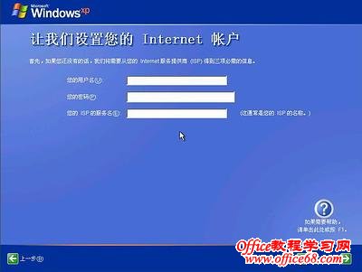 让你选择网络安装所用的方式,选典型设置点“下一步”出现如下图17 ![]() 点“下一步”出现如下图18 ![]() 继续安装,到这里后就不用你参与了,安装程序会自动完成全过程。安装完成后自动重新启动,出现启动画面,如下图19 ![]() 第一次启动需要较长时间,请耐心等候,接下来是欢迎使用画面,提示设置系统,如下图20 ![]() 点击右下角的“下一步”按钮,出现设置上网连接画面,如下图21所示 ![]() 点击右下角的“下一步”按钮,出现设置上网连接画面,如下图21所示 ![]() 这里建立的宽带拨号连接,不会在桌面上建立拨号连接快捷方式,且默认的拨号连接名称为“我的ISP”(自定义除外);进入桌面后通过连接向导建立的宽带拨号连接,在桌面上会建立拨号连接快捷方式,且默认的拨号连接名称为“宽带连接”(自定义除外)。如果你不想在这里建立宽带拨号连接,请点击“跳过”按钮。 在这里我先创建一个宽带连接,选第一项“数字用户线(ADSL)或电缆调制解调器”,点击“下一步”按钮,如下图22所示 ![]() 目前使用的电信或联通(ADSL)住宅用户都有帐号和密码的,所以我选“是,我使用用户名和密码连接”,点击“下一步”按钮,如下图23所示 ![]() 输入电信或联通提供的帐号和密码,在“你的ISP的服务名”处输入你喜欢的名称,该名称作为拨号连接快捷菜单的名称,如果留空系统会自动创建名为“我的ISP”作为该连接的名称,点击“下一步”按钮,如下图24所示 ![]() |