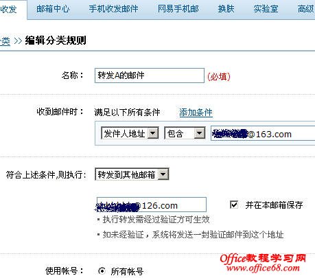 网易邮箱的功能十分强大,也非常贴近用户的需求。由于某种需要,笔者要将来自某个特定地址的邮件自动转发到指定的邮箱,用网易邮箱可轻松实现。以163邮箱为例,方法如下。 登录163邮箱,在左侧的导航区域选择“邮箱中心”,然后依次选择“邮件收发”、“来信分类”,单击“新建来信分类”按钮。 假如要将来自A的邮件自动转发到B邮箱,在“名称”右侧的文本框中输入一个标题,如“转发A的邮件”,在“收到邮件时:满足以下所有条件”的下方已显示了第一个条件,默认为“发件人地址”和“包含”,我们只需在其右侧文本框中输入要转发邮件的地址即可。这里可根据需要添加更多的条件。 在“符合上述条件,则执行”右侧的下拉列表中选择“转发到其他邮箱”,并输入转发到的邮箱地址,单击“确定”按钮。 邮件转发需经过转发接受者的验证,此时网易会自动发送一封邮件到所设置转发到的邮箱,对方必须在7天的有效期内完成验证。 验证通过后即可实现邮件的自动转发 |