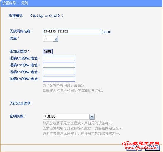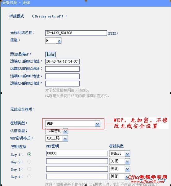 下边进入TL-WR703N配置界面进行无线配置: 步骤1:进入桥接模式,如图所示: