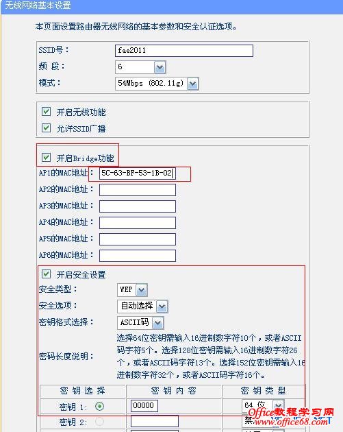 下图为TL-WR541G+的操作界面, 设置无线参数,指定信道为6,开启bridge功能且填上桥接对端TL-WR703N的设备MAC地址,并开启安全设置,如下图所示:
