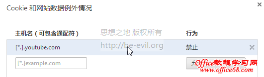 Firefox的浏览器设置方法类似 设置 - 隐私 - 历史 - 使用自定义设置 - 例外 - 添加 *.youtube.com 到阻止即可,参见下图 |
