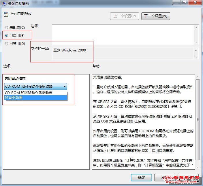 2、在弹出的“关闭自动播放”的窗口中,选择“已启用”单选卡,在下面的选项中按需要选择“CD—ROM和可移动介质驱动器”或“所有驱动器”。
