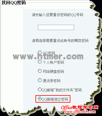 2、输入您的QQ号码,在“请再选择需要重设此帐号的哪类密码”中选取“QQ邮箱独立密码” 小提示:此方法还可以修改QQ密码、个人帐户密码、网络硬盘密码、通讯录密码、QQ邮箱“我的文件夹”密码。 |