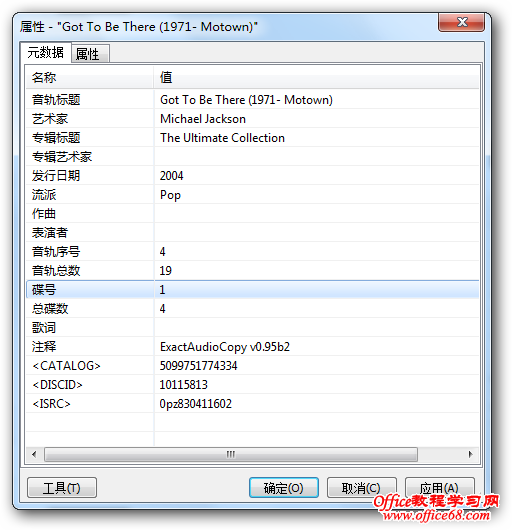 简单介绍一下碟号(discnumber)和碟数(totaldiscs): 比如Michael Jackson在2004年发行了一张精选辑<The ultimate collection>,这张精选辑包含有四张CD,为了从顺序上区分每一张CD,就给的属性标签里的“碟号(discnumber)”分别写入值1、2、3、4,“碟数(totaldiscs)”写入值4。 在foobar2000里“碟号”和“碟数”是作为一个音乐文件的基本属性存在的。而在千千静听的默认音乐属性标签编辑窗口中,你是找不到“碟号”和“碟数”的,当然如果音乐文件本身“碟号”和“碟数”中有写入值,那么在千千静听的高级属性里是可以看到discnumber和totaldiscs的。
