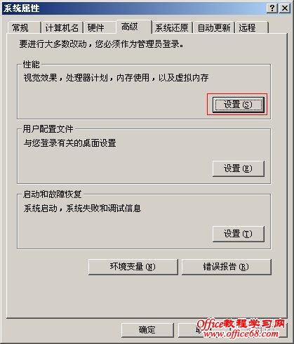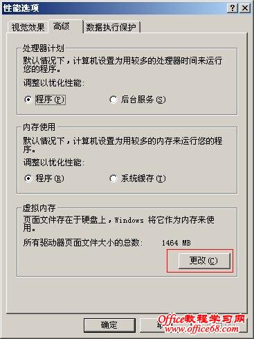 点击上图的性能设置按钮,出现性能选项窗口,再点击“高级”选项卡,如下图: