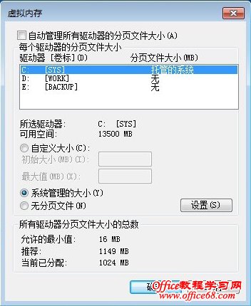 取消“自动管理所有驱动器的分页文件大小”核选框之后才能进行设置,Windows 7的默认是系统管理,而Windows XP上则默认是自定义大小。 三、常见问题1、我的内存非常大,是否可以把虚拟内存关闭掉? 天缘特别建议即使你的内存有3G、4G都不需要把虚拟内存设置关闭掉,因为现在的操作并不是非到内存耗尽时才去启动虚拟内存,而是把虚拟内存做个重要的即时补充,随时整体协调各工作任务,把暂时不用的内存数据先转移到虚拟内存中,留下内存给紧要的程序使用,经过整理的RAM内存空间执行效率会更高更快。 2、虚拟内存不足(太低)了怎么办? 一般的检查顺序是查毒杀毒、虚拟内存所在磁盘空间是否不足、虚拟内存设置限制是否太小等,逐个排除解决。也可以考虑把虚拟内存设置为系统管理状态。 |