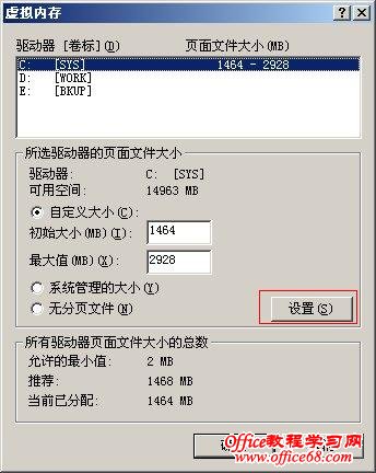 点开后,再选择高级选项卡(图略),再点击虚拟内存设置,如下图: