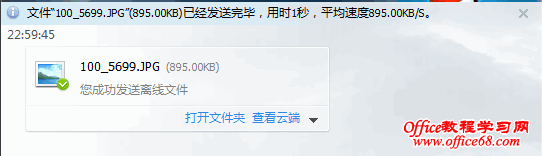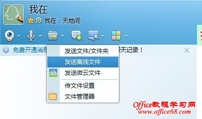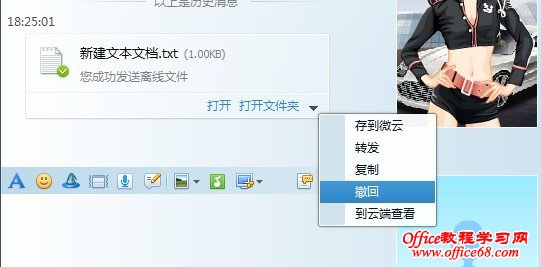 图2 方法步骤2、在离线文件发送完毕后,我们点击“打开文件夹”右边的小三角,选择“撤回”,将刚发送的离线文件撤回来,接下来就是重点了,QQ会弹出提示如下图所示: