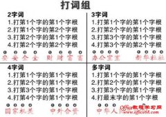 前面很多文章都在介绍字根,汉字的输入方法,不禁有人要问词组呢?怎么输入?其实,词组的输入有很多技巧,下面把我知道的告诉大家。 两字词组的输入 两个字组成的词组的输入方法是:取第一个字的第一、二字根和第二个字的第一、二字根,组成四码。 例如:单独:UJQY 键盘:QVTE 速度:GKYA 经常:XCIP 三字词组的输入 三...