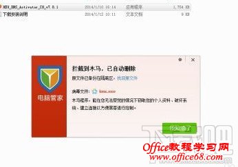 3:出现类似的情况不用担心,杀毒软件就是太敏感,将杀毒软件关掉一会儿就可以了,再重新打开激活工具,选择激活office2010。等一会后就好了。再接下来就是显示下面这个对话框