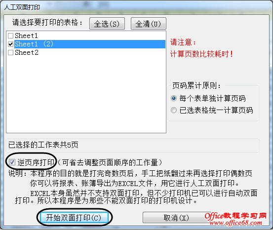 ②在“人工双面打印”对话框中勾选需双面打印的工作表,再勾选下方的“逆页序打印”选项,准备好打印机和纸张,点击“开始双面打印”按钮,按提示操作,就会以逆页序打印奇数页。