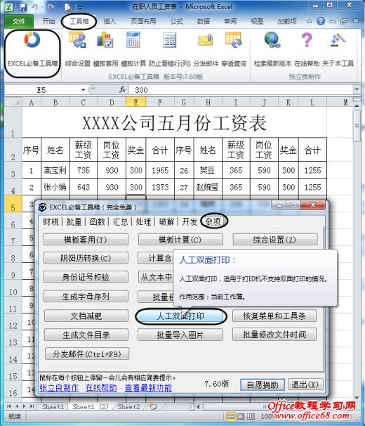 新官上任新举措,为节省开支,要求打印EXCEL表格时也要与WORD一样双面打印,而且列数较少的表格要分栏排版后再双面打印,但单位打印机不支持双面打印功能,EXCEL 2010本身也没有分栏和手动双面打印功能,每次都只能将其复制到WORD中操作,这让小王吃尽了苦头。请教达人朋友后找来“Excel多排表工具”和“EXCEL必备工具箱”两件免费宝贝,一下变得轻松多了。